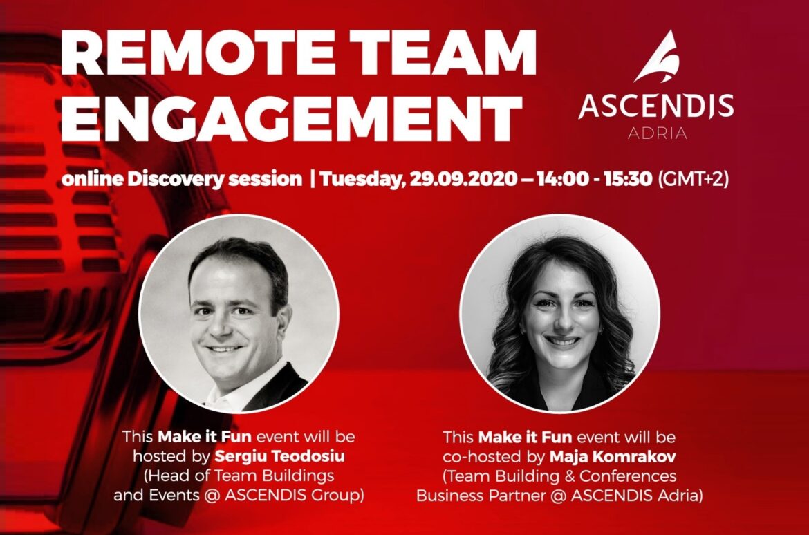 Регистрирајте се за бесплатна онлајн сесија и вебинар на тема „Ангажираност на ‘раздвоени’ тимови“ со Сергио Теодосиу – Лидер за Тим билдинзи и Корпоративни настани во компанијата ASCENDIS и од Маја Комраков експерт за АНГАЖИРАНОСТ НА „РАЗДВОЕНИ“ ТИМОВИ.