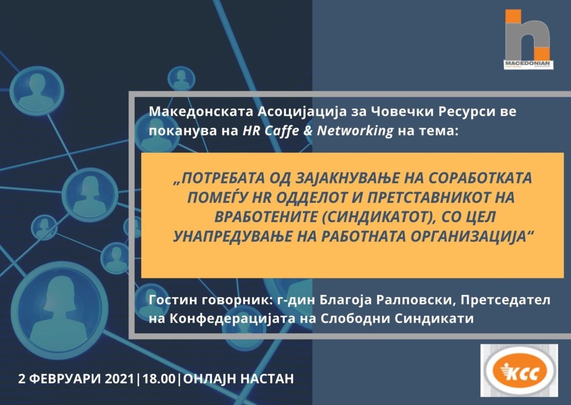 МАЧР ве поканува на првиот свој настан во 2021 година, HR Caffe & Networking на тема „Потребата од зајакнување на соработката помеѓу HR одделот и претставникот на вработените (синдикатот), со цел унапредување на работната организација“.
