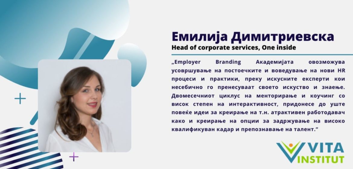 Сакајќи да ја доближиме Академијата до луѓето од македонската ЧР заедница, 24HR направи интервју со една од учесниците во првата група на Академијата за Employer Branding на ВИТА ИНСТИТУТ. Во продолжение, прочитајте за впечатоците на Емилија Димитриевска, Head of Corporate Services & HR во One Inside.