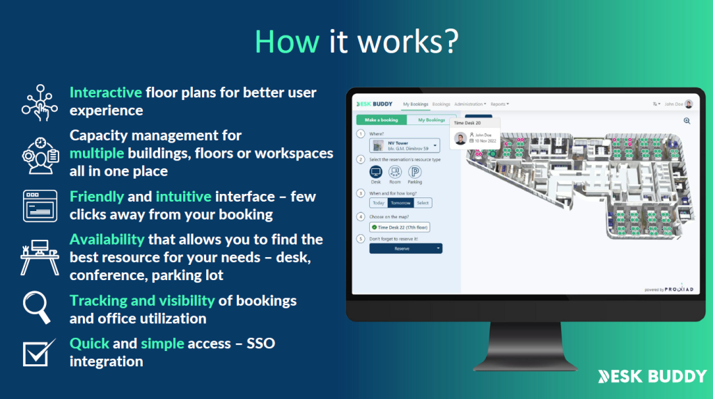 Во тие околности се појави идејата за Desk Buddy, не како продукт што треба да се продава, туку како решение што треба да функционира интерно. Намерата не беше да се воведе уште една алатка што луѓето ќе ја користат затоа што мораат, туку нешто што природно ќе стане дел од нивниот ден. Затоа и самиот концепт беше поставен многу едноставно, секој да може однапред да резервира каде ќе работи, кога ќе дојде и со кого ќе биде во канцеларија, без дополнителни компликации. Интеграцијата со Microsoft 365 дојде како логичен чекор, за да не се менуваат навиките, туку само да се надградат и поедностават.