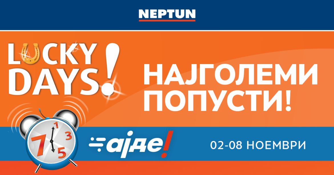 „Lucky days” од 02-08 ноември во „Нептун” – продажна акција со најголеми попусти! Овие “Среќни денови” потрошувачите ќе може да купуваат производи со најголеми попусти и до 60 рати.Разгледајте ги понудите во 25-те продажни салони на Нептун ширум Македонија или онлајн на Neptun.mk и изберете од најголемиoт избор на: телевизори, фрижидери, машини за перење и сушење, плотни, фурни, лаптопи и таблети, мобилни телефони, мали апарати за домаќинство и апарати за нега и убавина од брендовите: Beko, Samsung, LG, Huawei, Sony, Apple, Grundig, Elektrolux, Candy, Asus, Acer, Lenovo, Fuego, Bosch, Tefal, Rowenta и многу други.