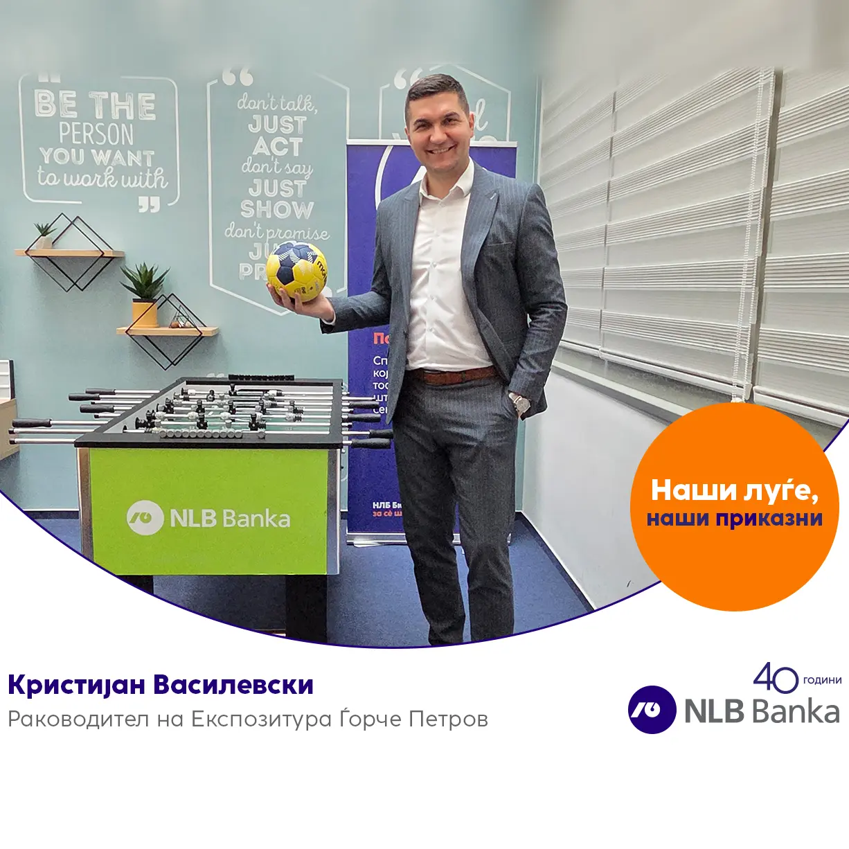 Кристијан Василевски е наш колега и раководител на Експозитурата Ѓорче Петров, со девет години работно искуство во НЛБ Банка АД Скопје. Неговата посветеност, професионалност и лидерски способности секојдневно се одразуваат во резултатите што ги постигнува со својот тим.